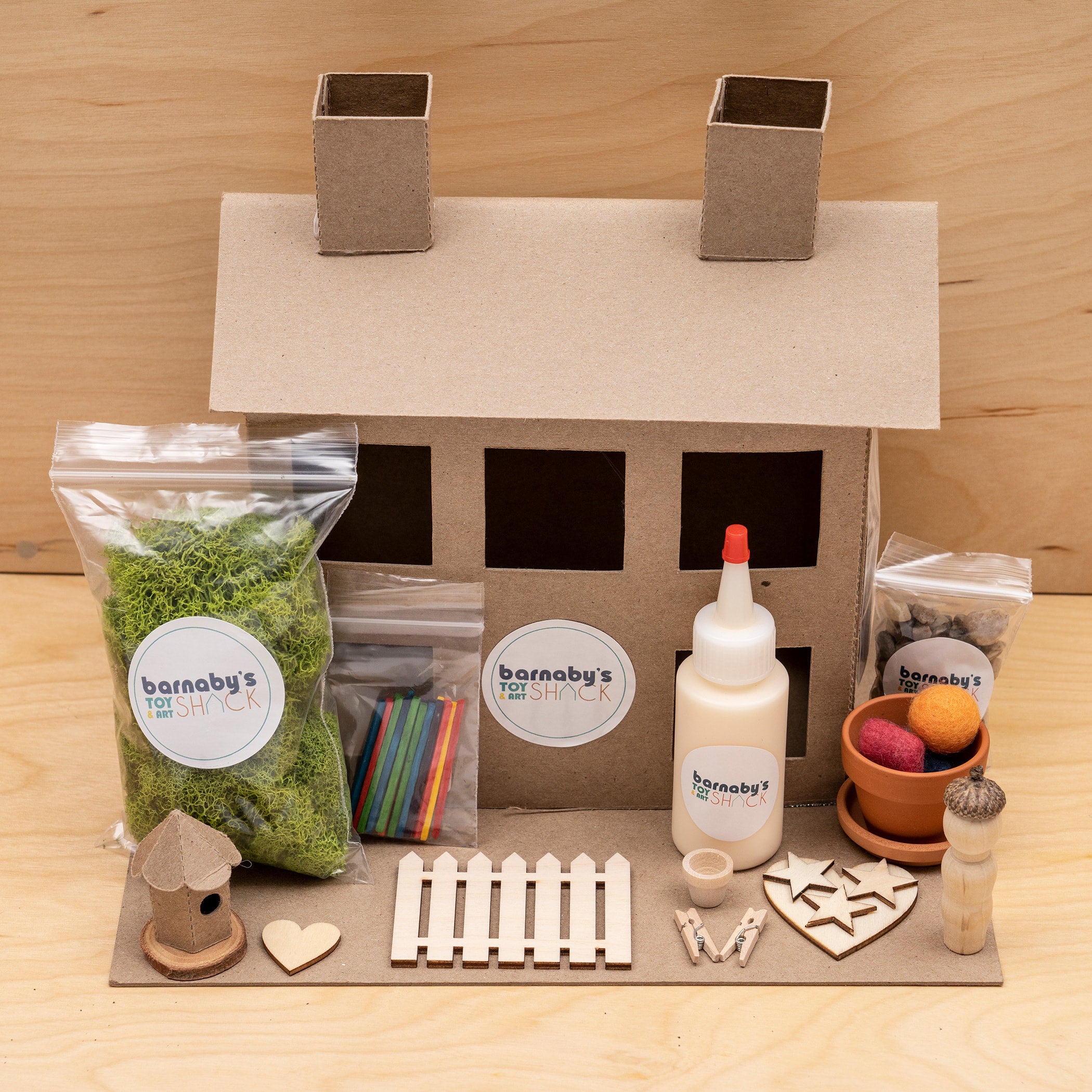 Create your own magical world with our custom Fairy House Kits! This special kit provides endless opportunities for creativity, discovery, and exploration using mixed media and our natural, raw materials. Each Barnaby’s Fairy House Kit includes: a kraft cardboard house and base, natural moss, wood picket fence, craft sticks, wool pom-poms, a terracotta pot, glue, bark slices, mini wood slices, peg doll, a grass square, yarn, felt, and paint & brush. Barnaby’s Creative Art Kits encourage a child’s creativity and their love of art at home!